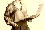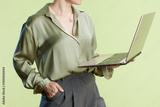 Professional woman with laptop on green background
