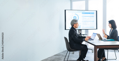 会議、会議室、ミーティング、ビジネス、コピースペース、企業、モニター、提案、相談、日本人、経営、男性、女性、仕事、職場、オフィス、打ち合わせ、ブリーフィング、人材、ミドルエイジ、シニア、中年、社長、経営者、大画面、スライド、プレゼンテーション、営業、カウンセラー、アドバイザー、コンサルタント、面談、カウンセリング、会話、コミュニケーション、計画、企画、プロジェクト、説明、報告、資料、データ、コンサ