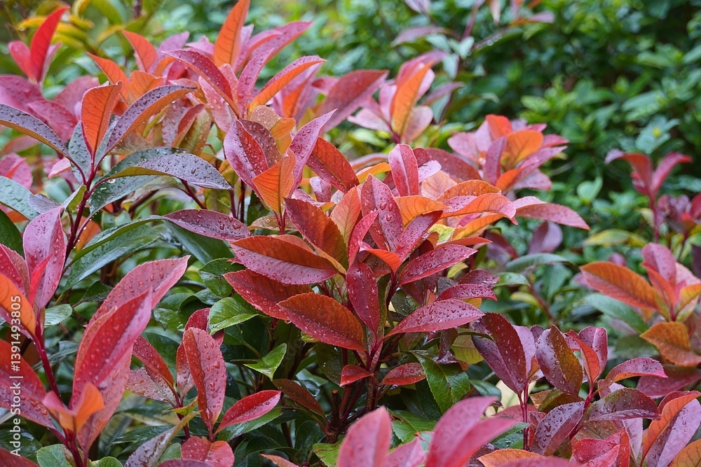 Red and green leaves of a photinia fraseri red robin shrub, after the rain