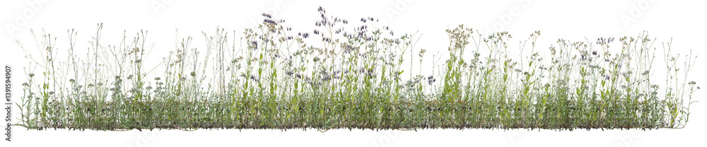 Various types of wild flowers and grass field in nature, Tropical forest isolated on transparent background - PNG file, 3D rendering for create and design