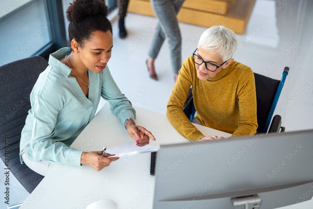 Business woman in wheelchair working with colleague in modern inclusive office. Diversity, support