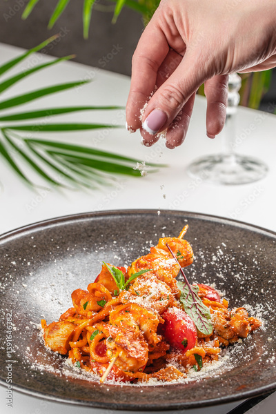 Pasta spicy tomato sauce with shrimp. Food recipe background. Close up. top view