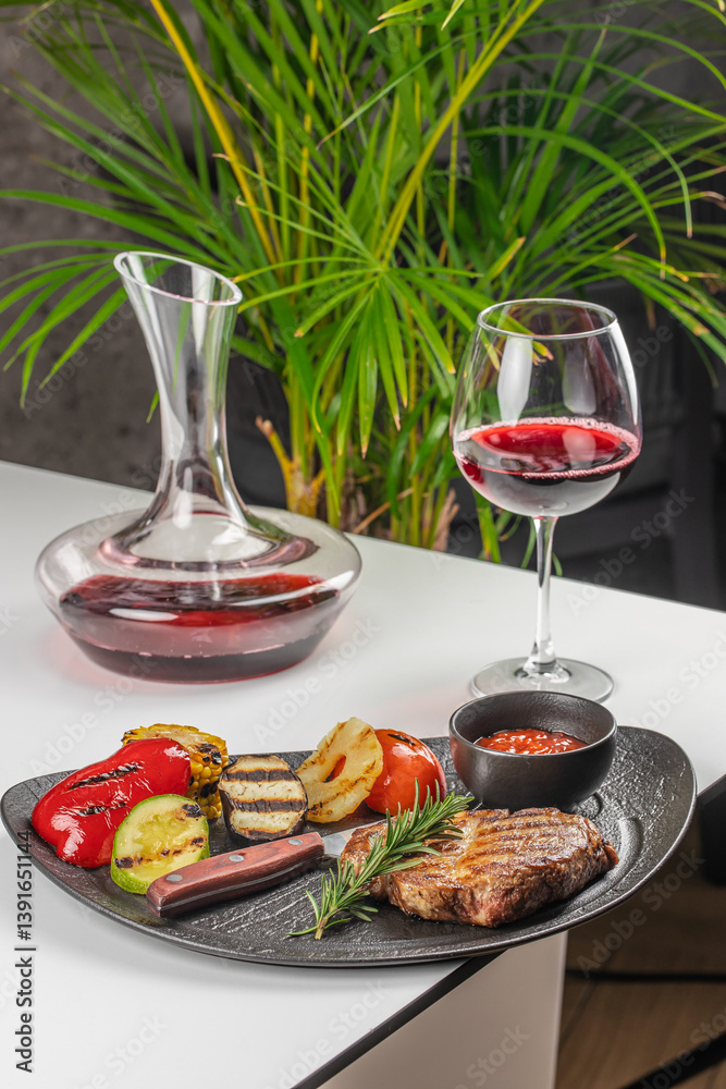 Steak with grilled vegetables and red wine, delicious and healthy food for lunch or dinner. dietary meat and vegetables, with grilled vegetables