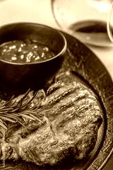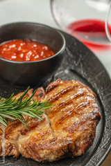 grilled pork steak with herbs and tomato sauce. Close up. top view