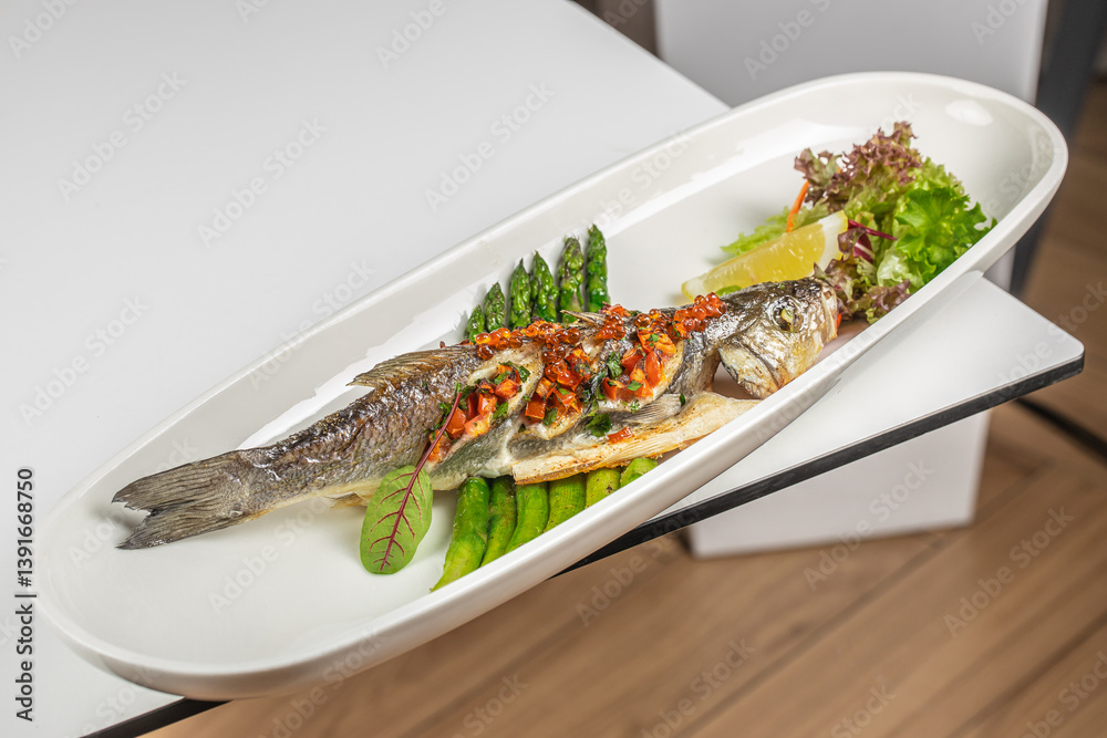 Roasted sea bass with salad asparagus vegetables served with red caviar, top view. copy space
