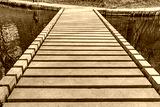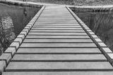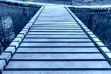 Concrete low footbridge on a stream or small river. Construction of a modern pedestrian bridge made of rectangular concrete blocks