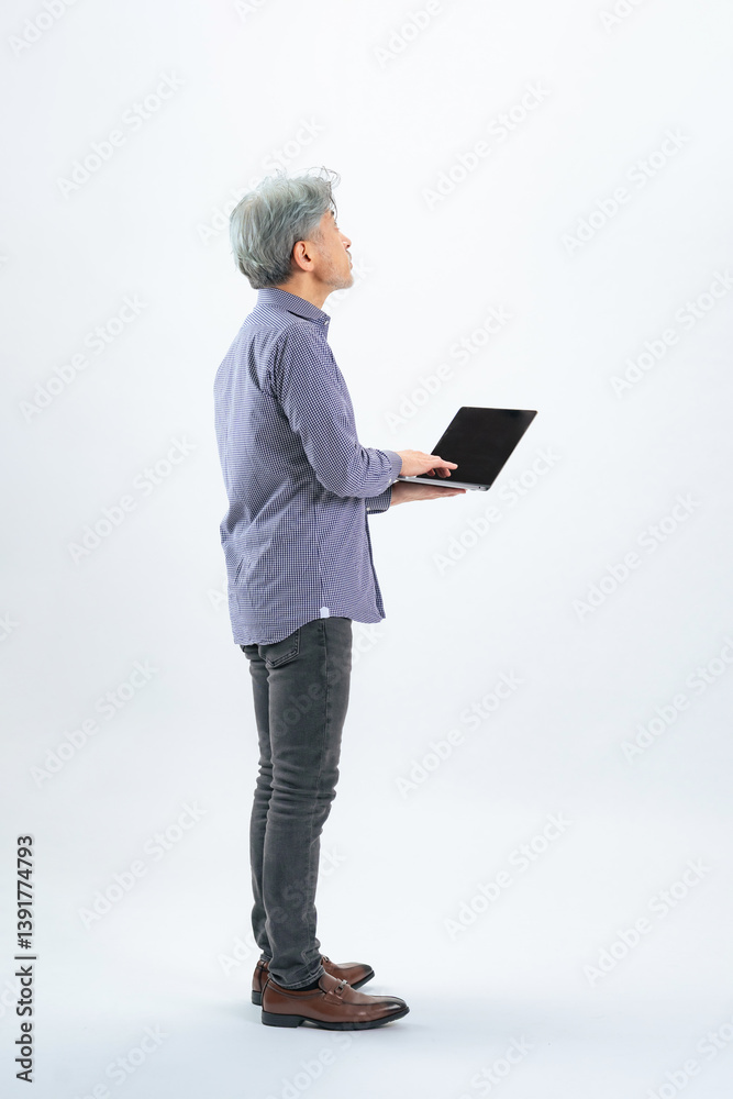 ノートパソコンを使うシニア男性の後ろ姿の全身写真