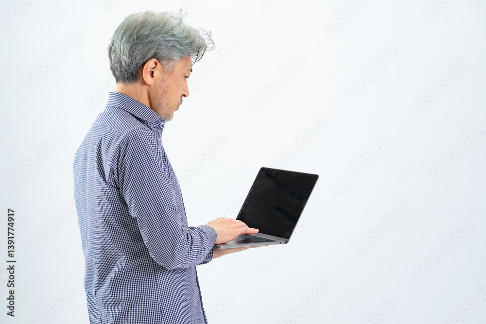 ノートパソコンを使うシニア男性の後ろ姿の全身写真