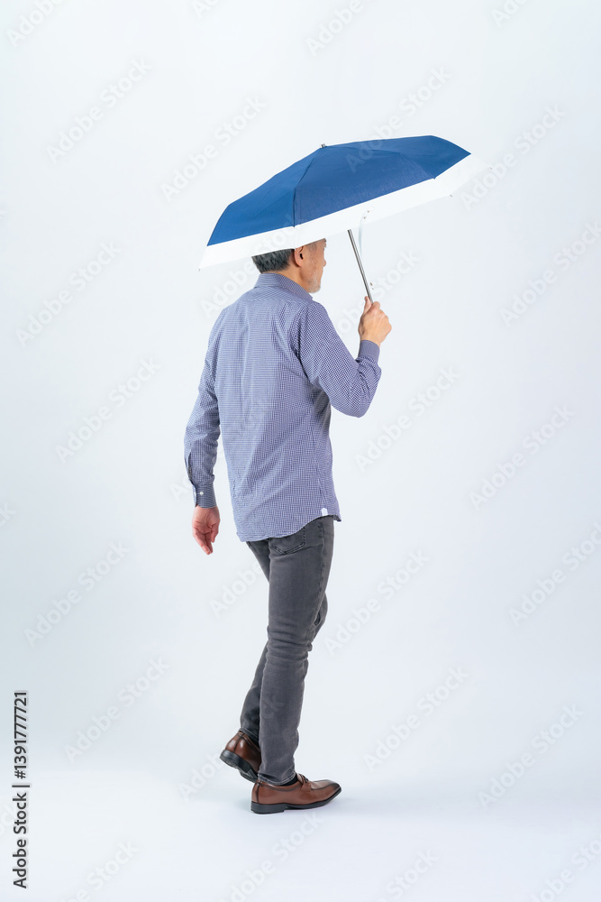 日傘をさして歩くシニア男性の後ろ姿の全身写真