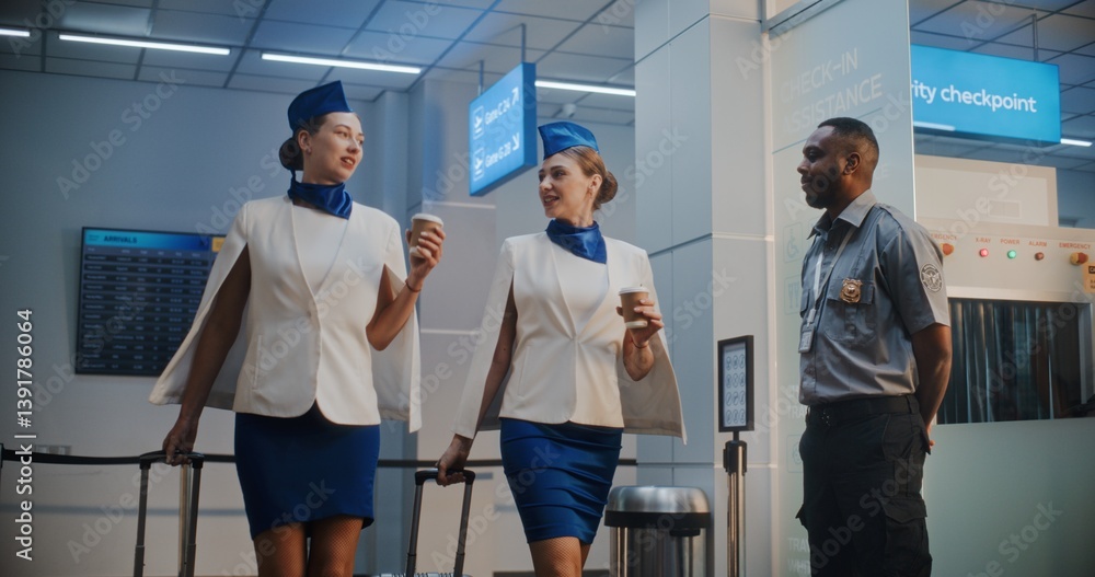 Flight Crew in Airport Terminal: Mature Airline Captain and Two Beautiful Stewardesses in Uniforms Walking with Suitcases for Boarding Flight, Passing by TSA Worker at Security Checkpoint. Slow Motion