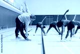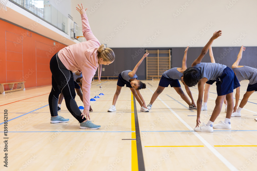 In school gym, female teacher leading group of diverse students in stretching exercises