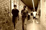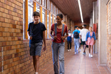 Walking in school hallway, students with backpacks talking and smiling