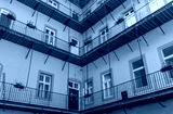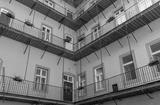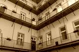 Long balconies of the apartments in inner courtyard of historic multistoried building, Bratislava, Slovakia