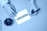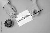 Conclusion concept. Final part or judgment of a process, argument, or discussion, where the key points are summarized, and a final decision or outcome is presented. Woman and notes with message