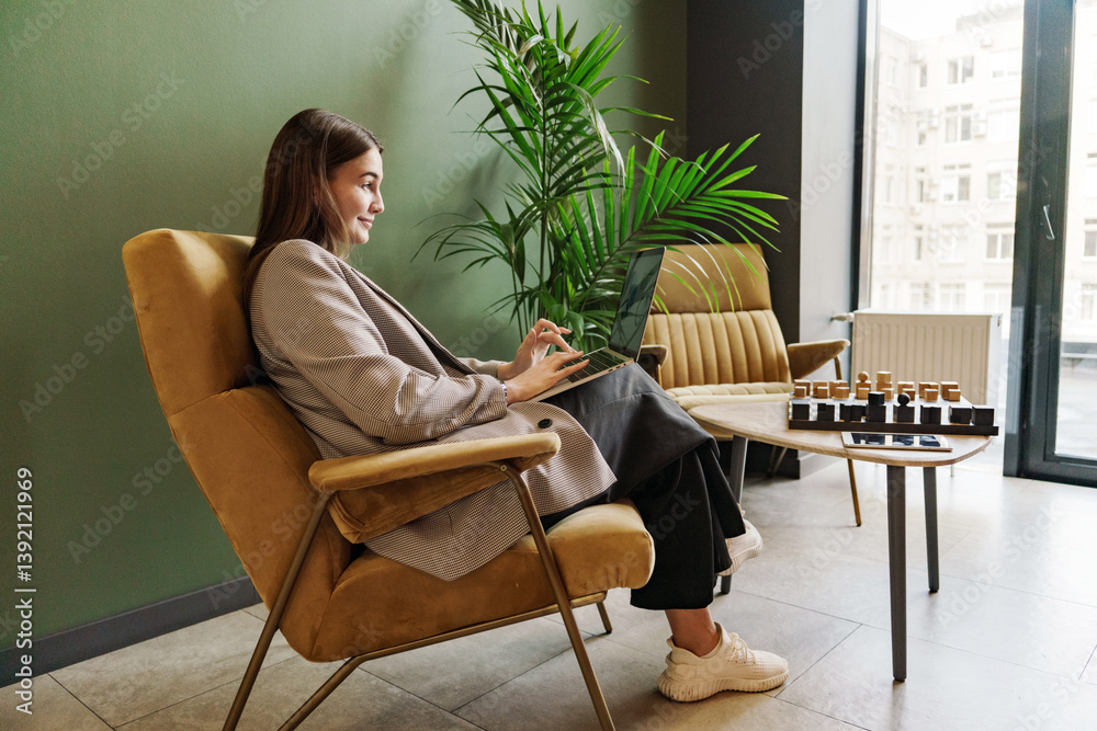 Focused Professional Working on a Laptop in a Modern, Airy Workspace With Greenery and Stylish Decor