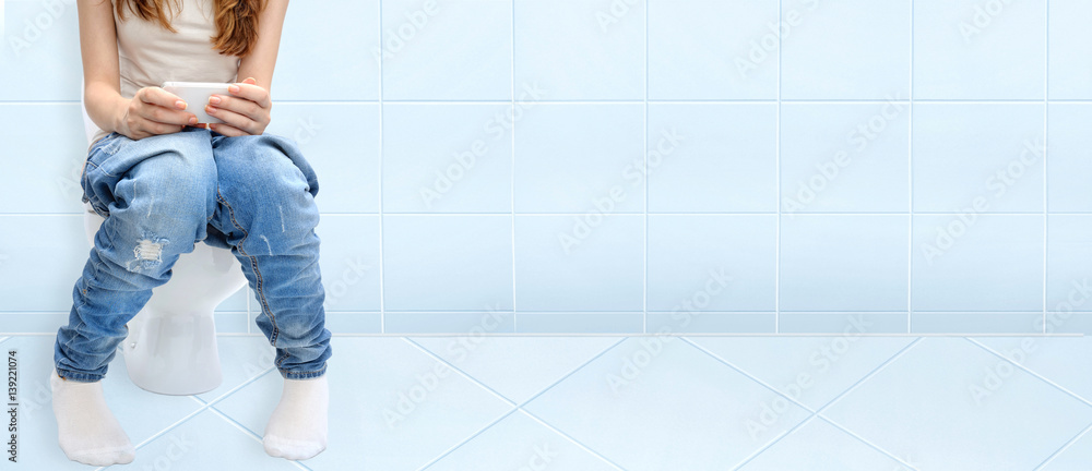 Young woman sitting on bathroom or wc toilet bowl using phone in hands .