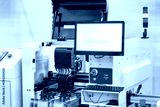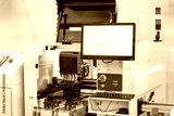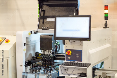 CNC machine. Industrial equipment with computer control. Monitor and keyboard on production machine. CNC equipment in factory. Printed circuit board production machine. PCB manufacturing at factory