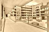 A contemporary apartment building view showcasing balconies, a courtyard garden, and modern architectural design elements that promote urban living.