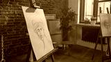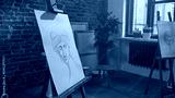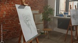 Shot of modern art class room, canvas with female pencil sketch portraits stand on easels and antique woman head model statue.