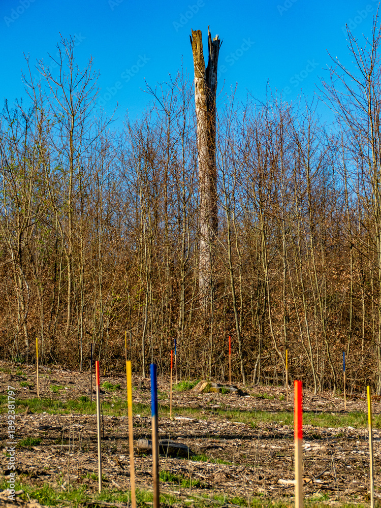 Wiederaufforstung im Mischwald durch Anpflanzen von jungen Pflanzentrieben an bunten Stöcken