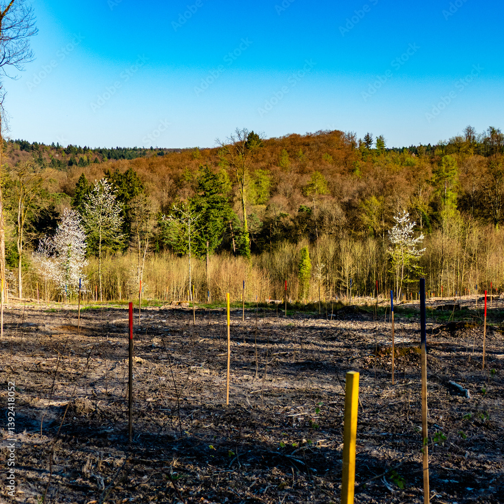 Wiederaufforstung im Mischwald durch Anpflanzen von jungen Pflanzentrieben an bunten Stöcken