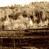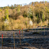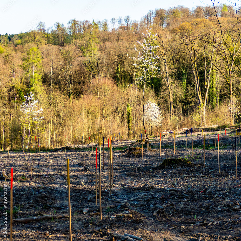 Wiederaufforstung im Mischwald durch Anpflanzen von jungen Pflanzentrieben an bunten Stöcken