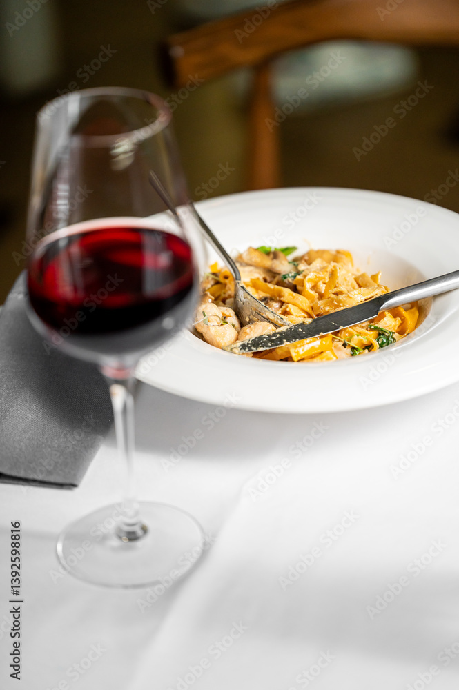 A glass of red wine is positioned next to a plate of pasta, beautifully arranged with fresh ingredients. The setting offers a cozy and inviting atmosphere for a delightful meal.
