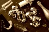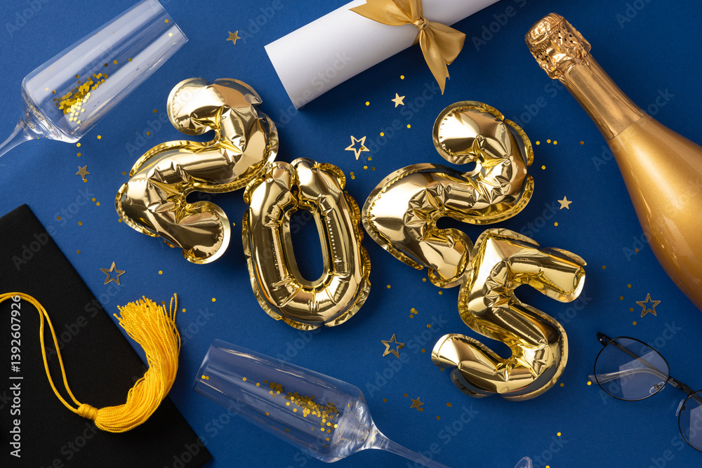 Golden 2025 balloons surrounded by graduation and celebration themed objects on a blue background