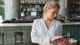 Female Owner Or Manager Of Restaurant Checking Digital Tablet Standing At Bar