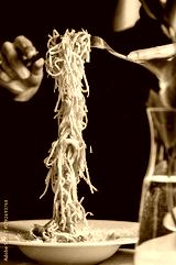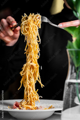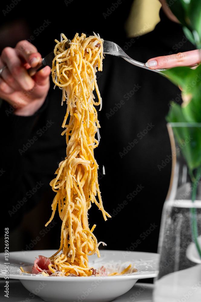 A close-up of a fork lifting a generous portion of spaghetti from a plate, showcasing its glossy texture. The elegant presentation highlights a delicious meal in a refined dining setting.