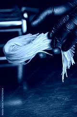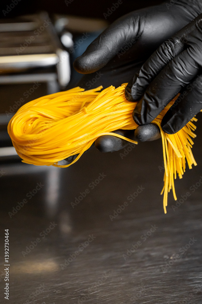A close-up of hands wearing black gloves holding freshly made yellow pasta. The vibrant strands are delicately crafted, showcasing the art of pasta preparation in a professional kitchen.