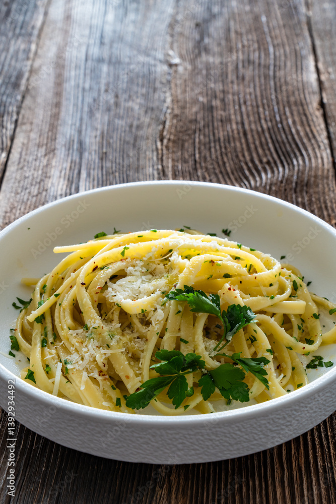 Pasta with garlic and parsley on wooden table. Spaghetti aglio olio on wooden background