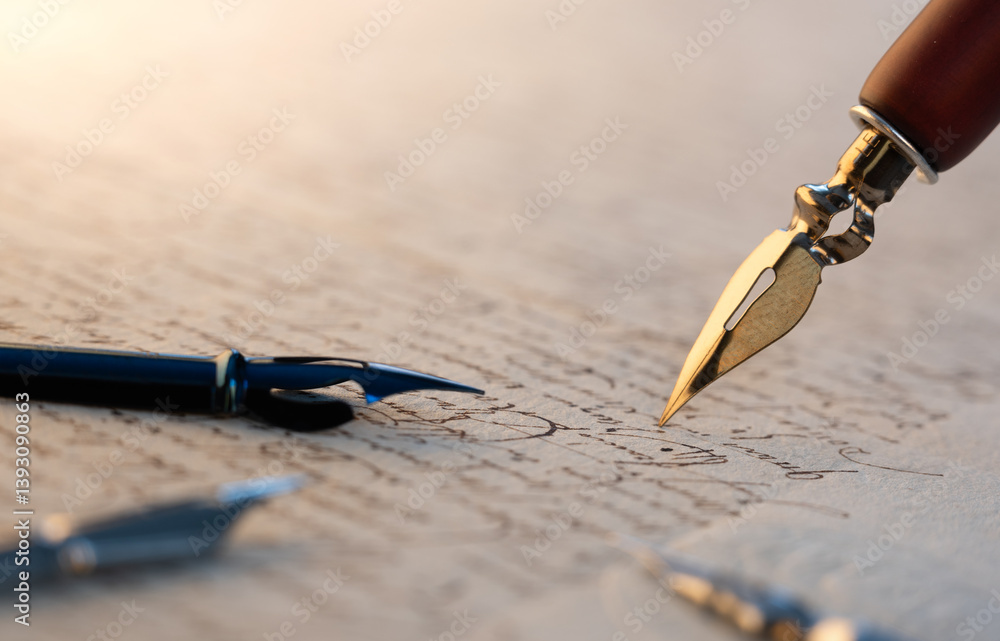 Fountain pen on an antique handwritten letter. Vintage nib pen and handwritten cursive style font copperplate, spencerian. Old history background. Retro style.
