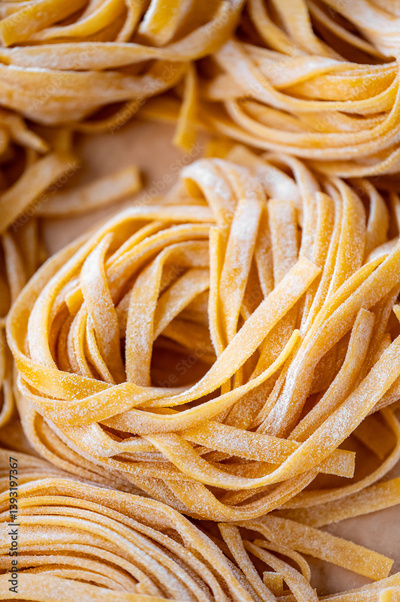 Freshly made orange fettuccine pasta, intricately arranged in circular nests, dusted lightly with flour to prevent sticking. Ideal for culinary and food-related projects.