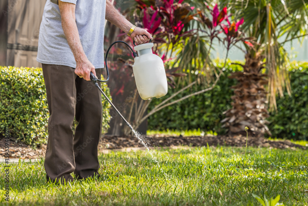 Man spraying weed killer herbicide on green grass residential yard. Landscaper using pump chemical pesticide sprayer for lawn weed control.