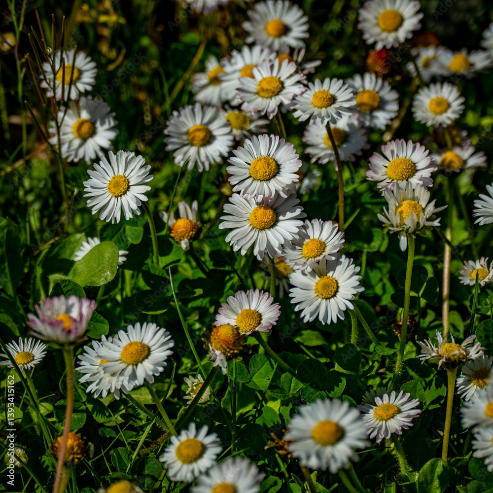 Viele Gänseblümchen auf einem Rasen