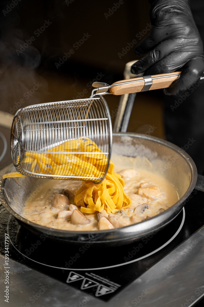 A chef in black gloves uses a basket to lift cooked fettuccine pasta into a skillet of creamy sauce and mushrooms, highlighting culinary precision in a modern kitchen.