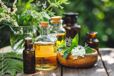 Pure fresh organic ingredients for cosmetics and perfumery production. Essential oil, camomile, herbal extracts. Aromatherapy, beauty and health care. Ayurveda, alternative medicine, naturopathy