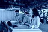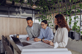 A diverse and creative team is energetically discussing their innovative plans in a stylish office filled with plants