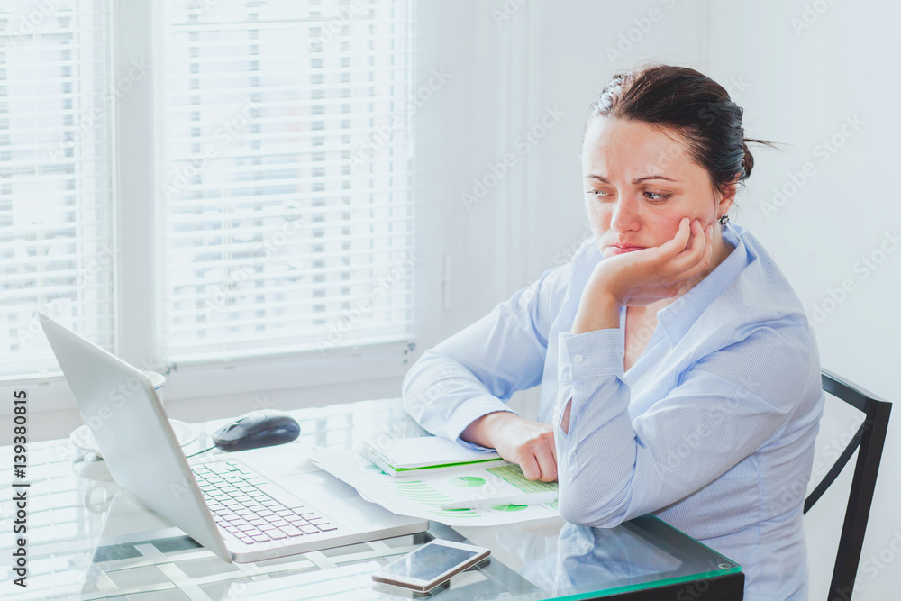 doubt concept, difficult job, business woman in front of complex project with big responsibility, scared uncertain employee in the office