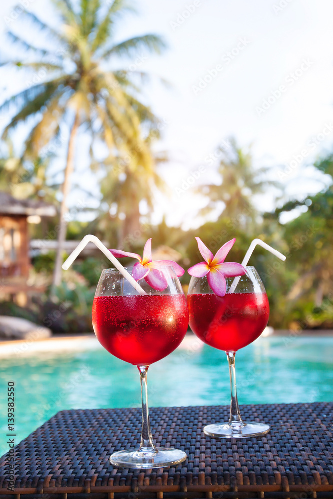luxurious beach hotel, two beautiful exotic cocktails near swimming pool, holidays or relaxation concept