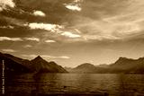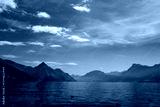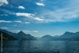 Alps mountain background. Swiss Alps mountain on sunny day. Mountain under clouds in blue sky. Blue nature background. Blue lake with sky near blue mountain.