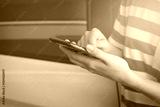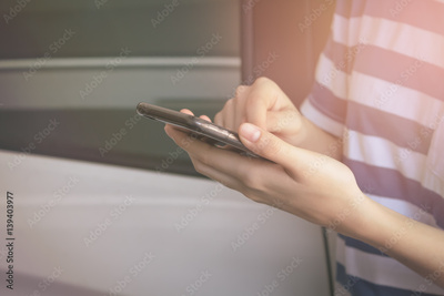 woman hand holding and using mobile on car background, concept calling mechanic service from repair shop. vintage effect
