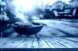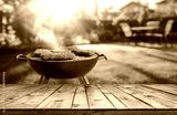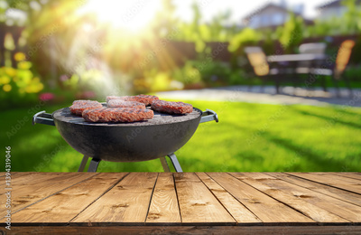 summer time in backyard garden with grill BBQ, wooden table, blurred background