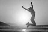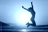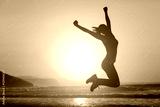 Silhouette of happy joyful woman jumping and having fun at the beach against the sunset. Freedom and leisure vacation concept.