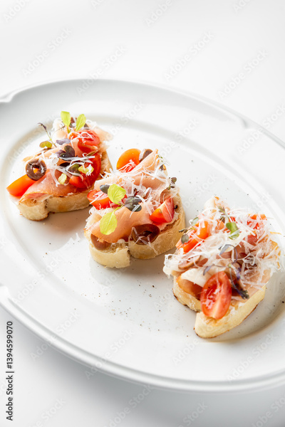 Three artisanal bruschetta topped with prosciutto, cherry tomatoes, and microgreens. Arranged on a white plate, they present a colorful and enticing culinary delight.