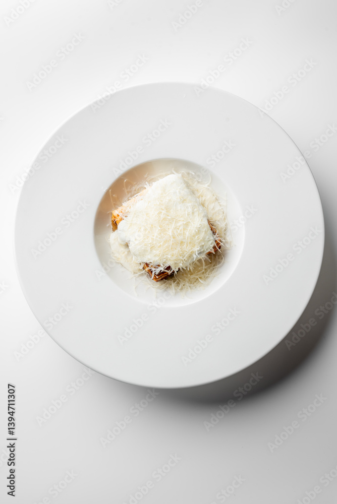close-up of a gourmet lasagna slice topped with melted cheese and grated Parmesan, served in a white bowl. dish showcases layers of pasta, meat, and sauce, making it visually appealing and appetizing.