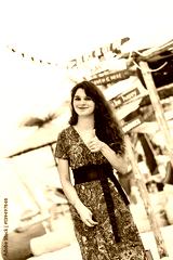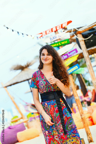 beautiful brunette in a long dress on the beach near the bar or go dancing. Concept of entertainment and recreation