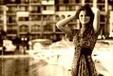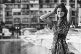 attractive brunette in long colorful dress standing alone on the beach against the backdrop of yachts and town at sunset