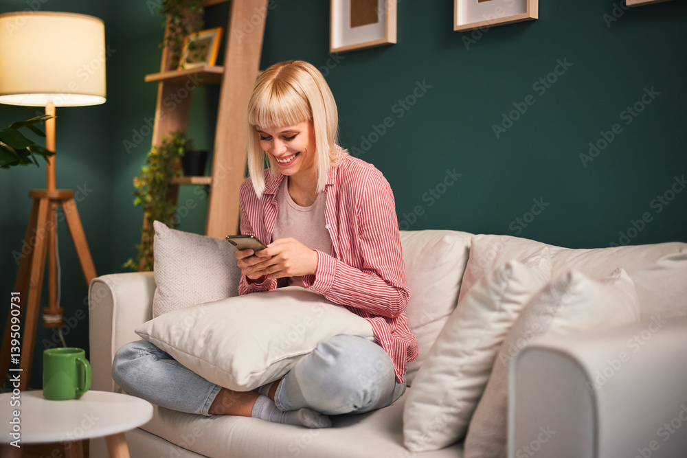 Smiling young woman using smartphone while sitting cross-legged on sofa at home